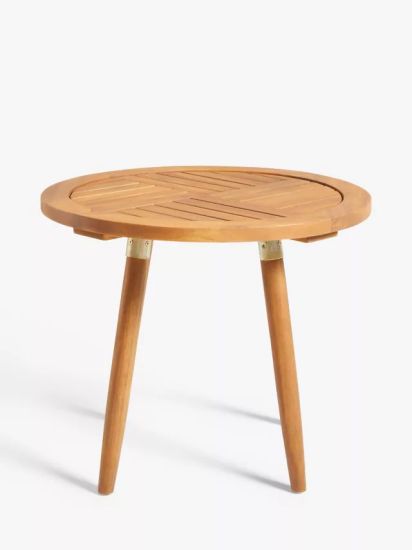 • Our range of outdoor wooden furniture is all made from sustainably sourced, naturally weather-resistant tropical hardwood. Round garden side table with geometric design and elegant tapered legs, foot covers protect floors and furniture legs, and adjustable height to accommodate uneven surfaces.